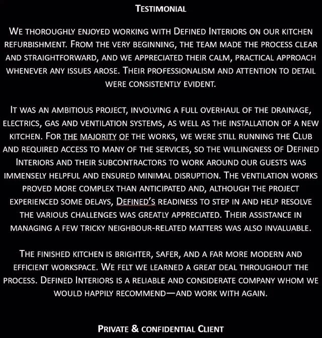 Defined Interiors have offered a professional service and have accommodated numerous changes to the scheme and have provided early cost advice which has allowed the client to make decisions based in firm lump sum prices. We are currently discussing further schemes with Dominic Maher and his team and would not hesitate in recommending Defined Interiors on further projects. “